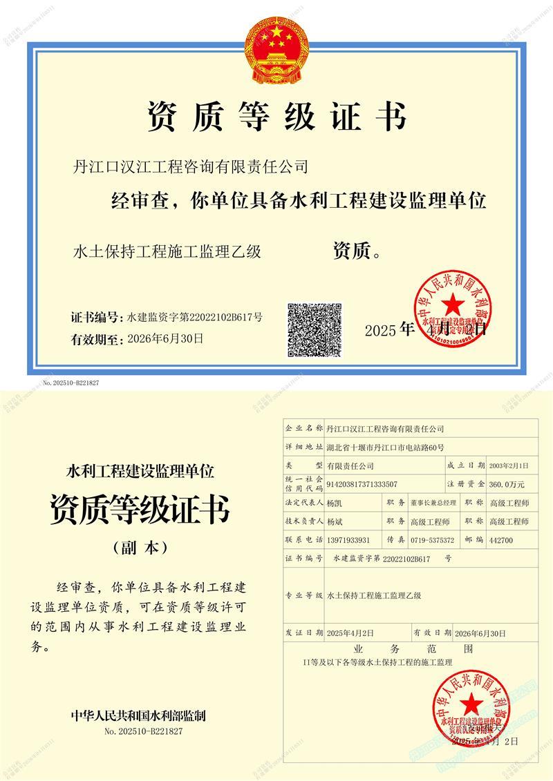 (原漢江綜合開發(fā)公司水利水電監(jiān)理中心)成立于 1989年3月,1993年6月經(jīng)水利部審批成為首批注冊監(jiān)理單位 (隸屬于長江水利委員會), 注冊資本 360萬元 。公司位于湖北省十堰市丹江口市電站路。公司目前擁有水利部頒發(fā)的 水利工程施工監(jiān)理甲級 、 水土保持工程施工監(jiān)理 乙 級 資質(zhì) ;住建部頒發(fā)的 房屋建筑 、 市政公用工程監(jiān)理 乙 級資質(zhì) 。 可獨立承擔(dān) 各類水利水電工程 、 一般工業(yè)與民用建筑工程監(jiān)理 , 土地整治 , 招標(biāo)代理 、 技術(shù)咨詢 等業(yè)務(wù)。公司實行董事會領(lǐng)導(dǎo)下的總經(jīng)理負責(zé)制,下設(shè)辦公室、經(jīng)營部、財務(wù)部、工程技術(shù)部等職能部門。……